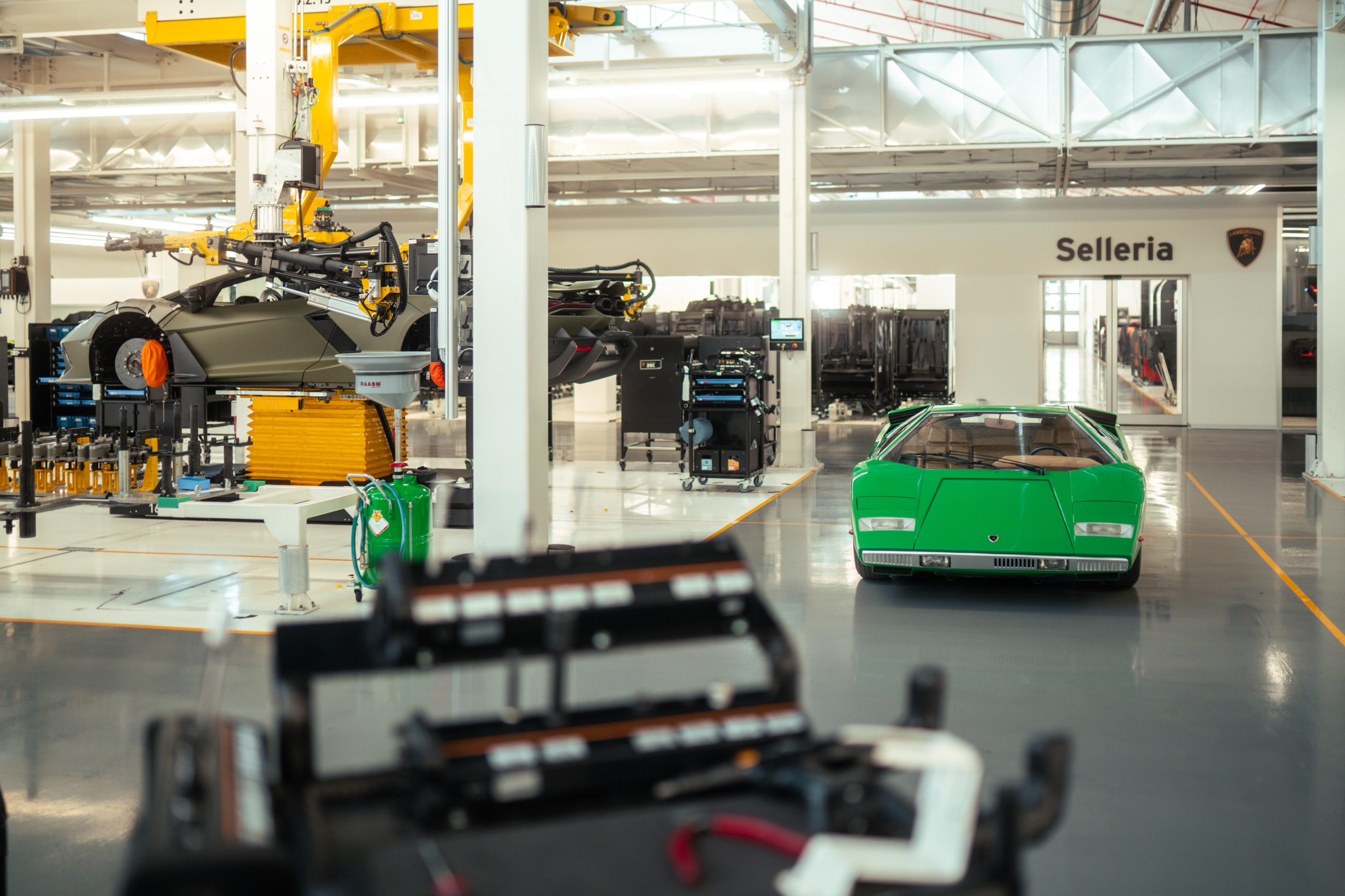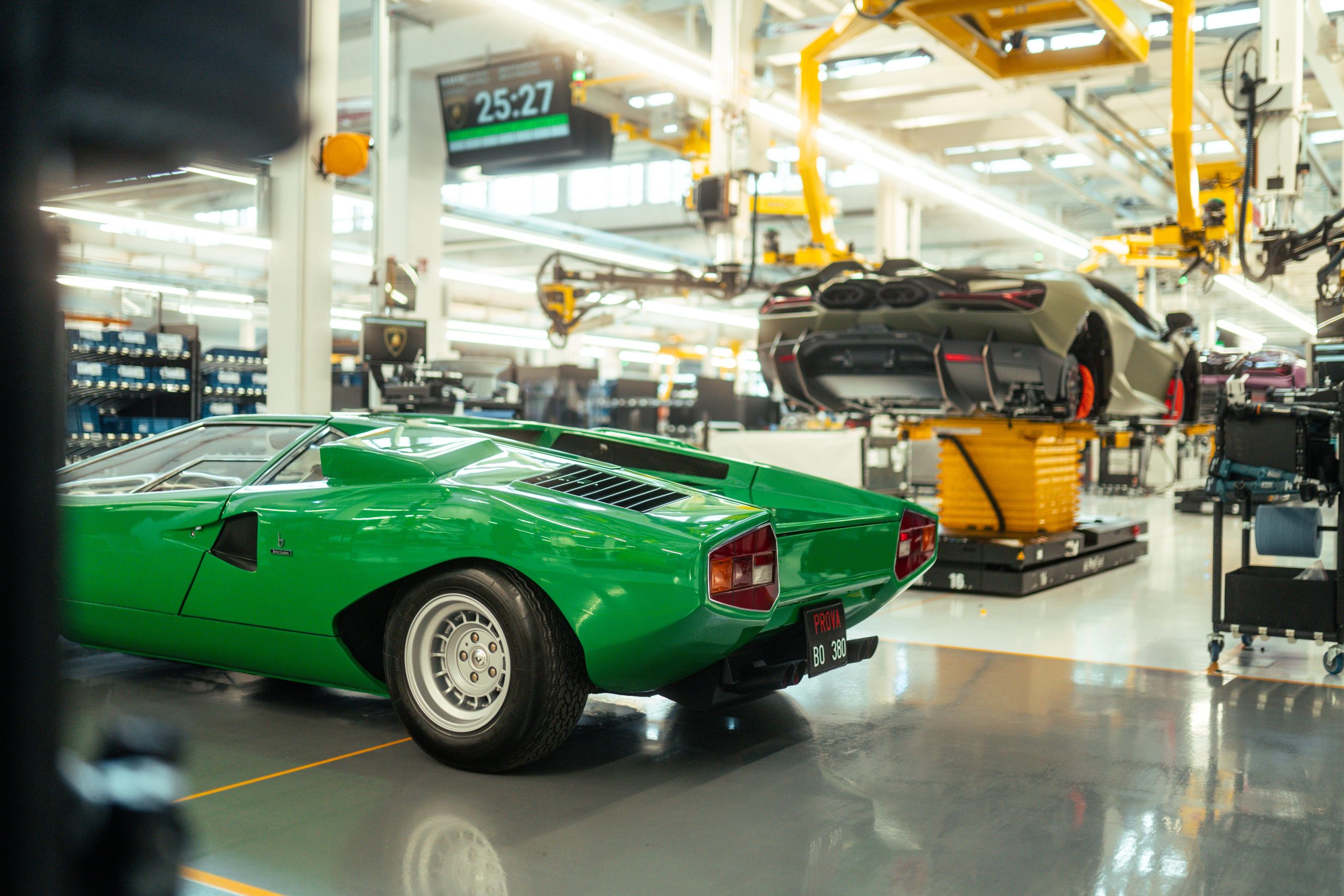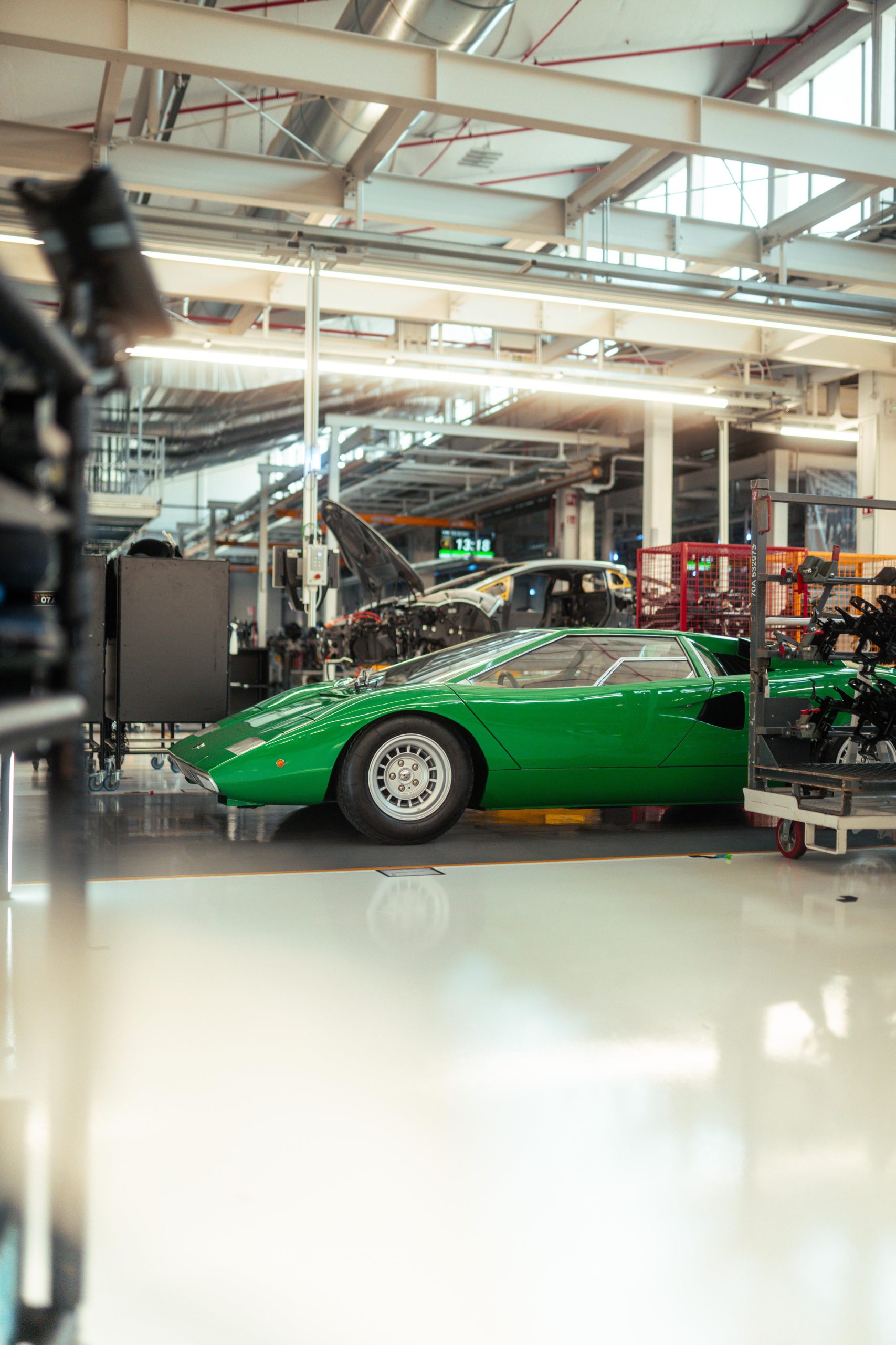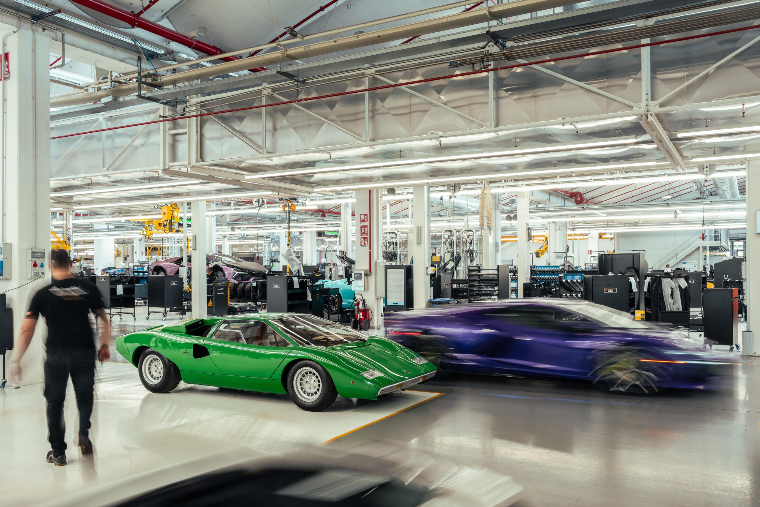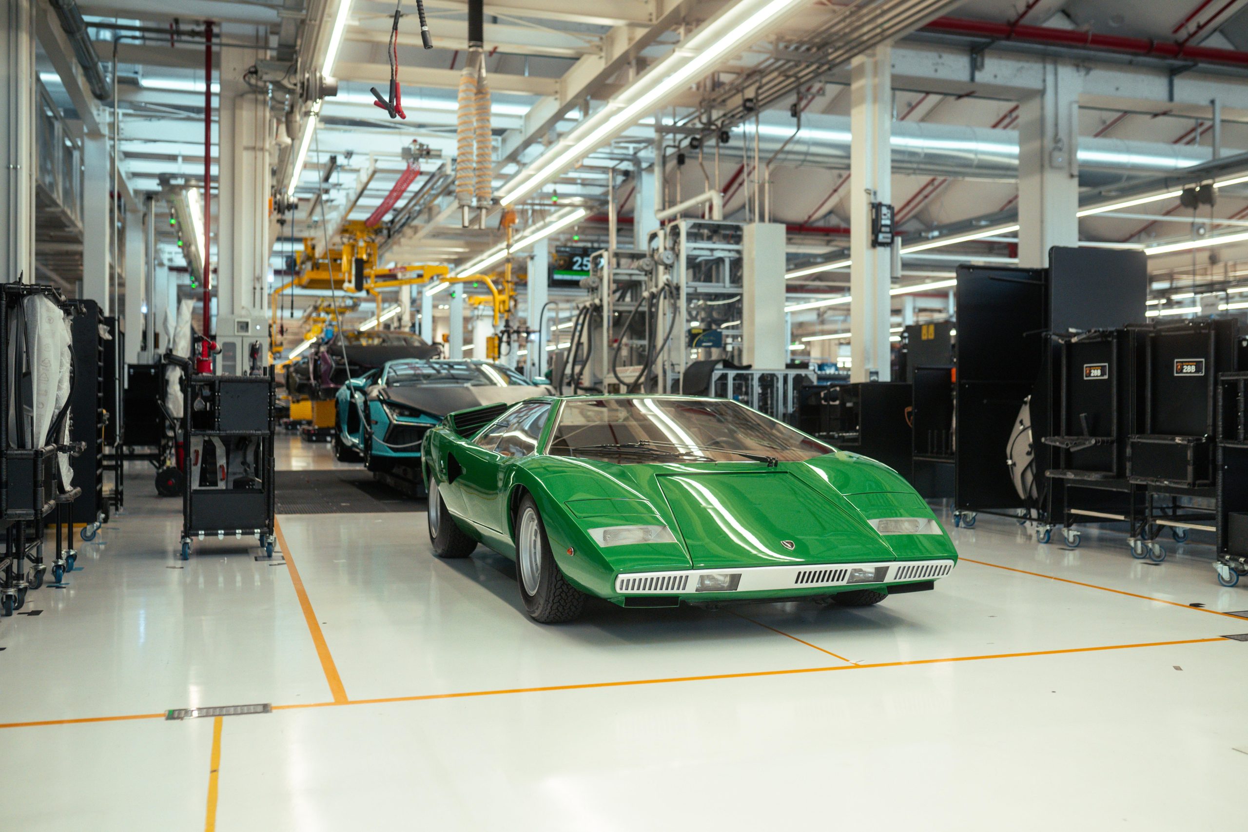 The original Lamborghini factory comprised a 12,000 m2 covered area, with construction starting in 1963 and finishing in 1966, the same time as the gearbox and differential also started to be produced in-house. The factory included the production area, offices, testing rooms and service workshop. Production included two production lines: one for the engines and mechanical parts and the other for car assembly. On 18 October 1968, Lamborghini announced the forthcoming completion of the construction of three new industrial buildings, adding 3,500 m2 of covered area. Today the factory is quite different, covering an area of 346,000 m2, but the area where the Countach was assembled, known as the No.1 Countach Assembly Line, remains the same, and is now where the Revuelto, the new Lamborghini 12-cylinder plug-in hybrid car, is produced. During the Countach years, the assembly line was simple and small scale, with all the operations carried out manually. The bodywork panels were beaten and then checked on a wooden template before being welded together and adjusted on the car body mold. This final processing was essential, given that each part, having been produced and assembled by hand, appeared identical to the others but in reality each was slightly different. The complete body, still in raw aluminum, was then combined with the frame. This unit, sitting on an industrial trolley that ran on rails, traveled between the various assembly stations where the different mechanical parts were fitted. The Countach was also the first to involve the Lamborghini Upholstery Department, which in the beginning was only for the fitting and assembly of the interiors in partnership with external suppliers. It eventually became completely autonomous, including in terms of leather upholstery and stitching, becoming an essential part of the personalization still offered today by Lamborghini to its clients through the Ad Personam program. Today, the production line has changed, as has the machinery and materials used and is much more organized, efficient and ergonomic. While in the 1970s aluminum was used, now there is carbon fiber, which is also produced at the Sant’Agata Bolognese site. What hasn’t changed is the passion and care with which the operators produce the new cars.