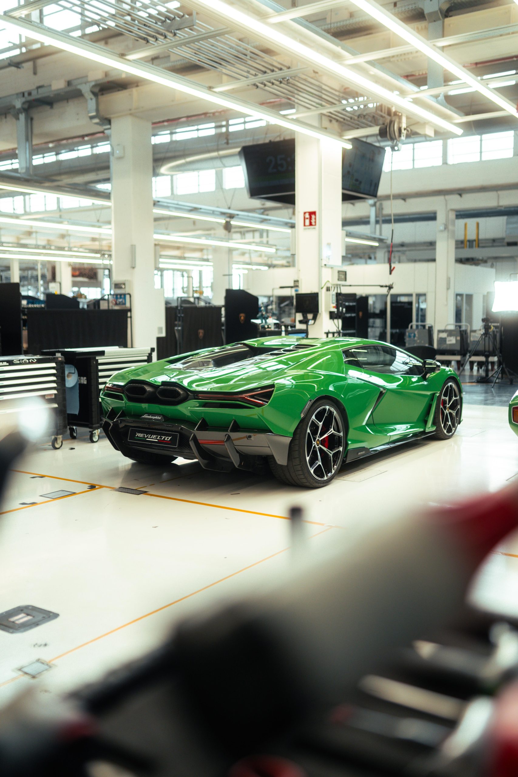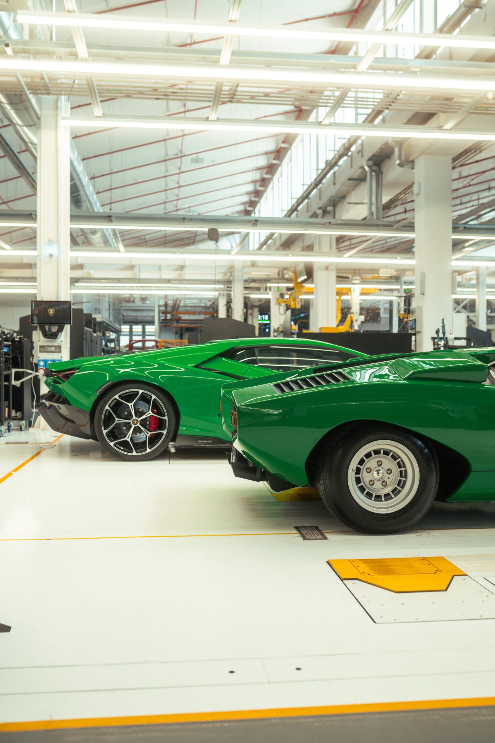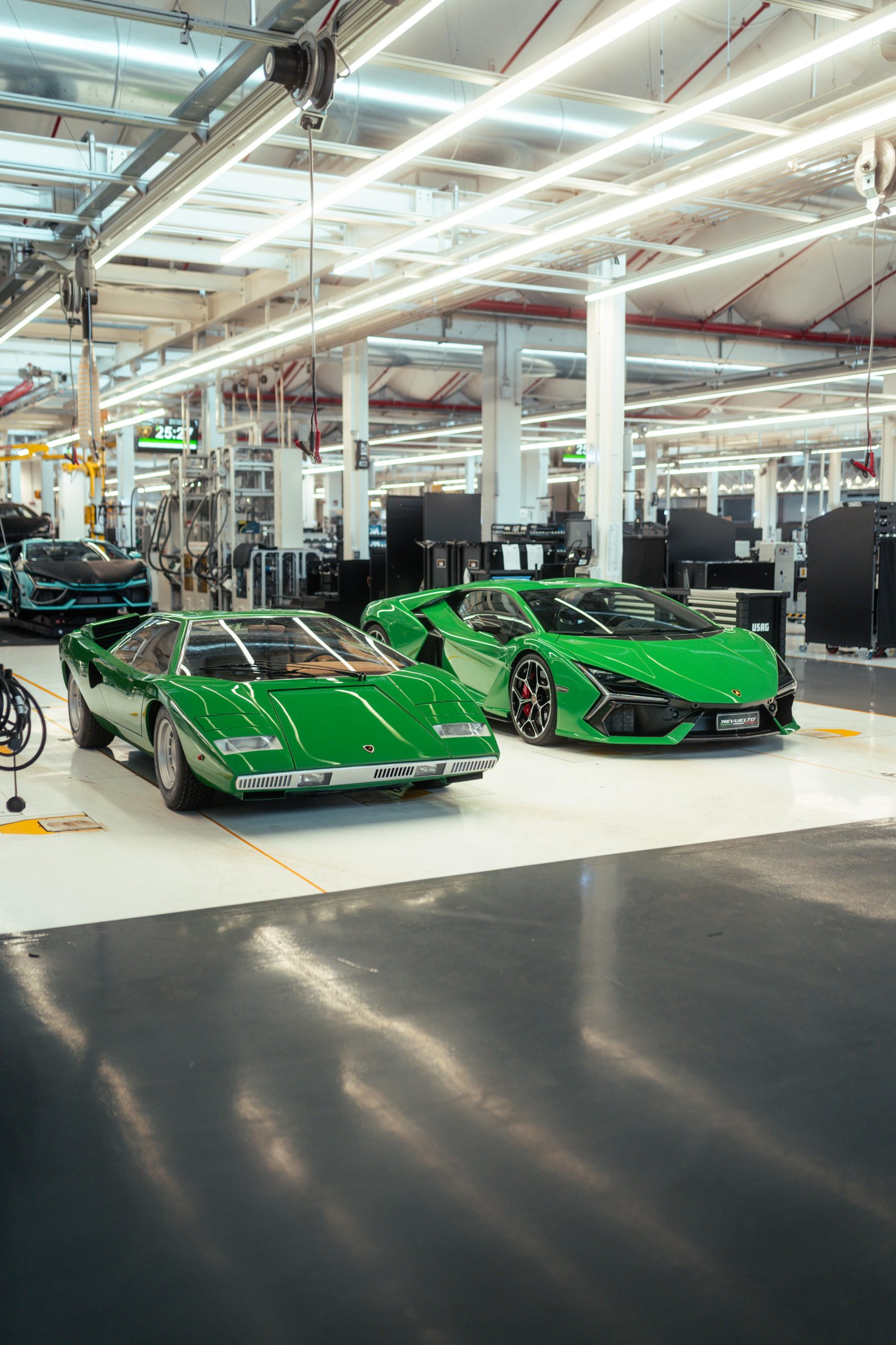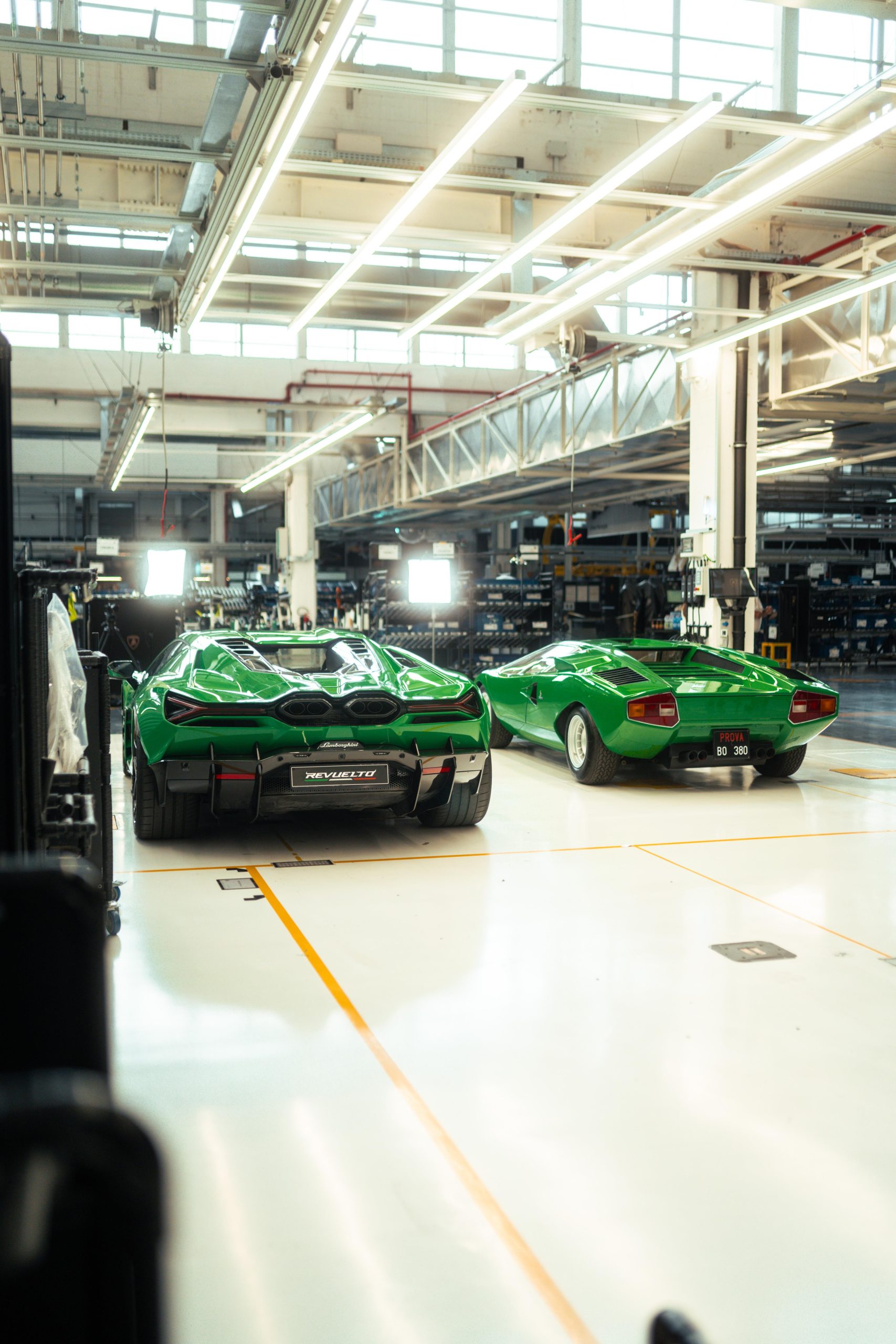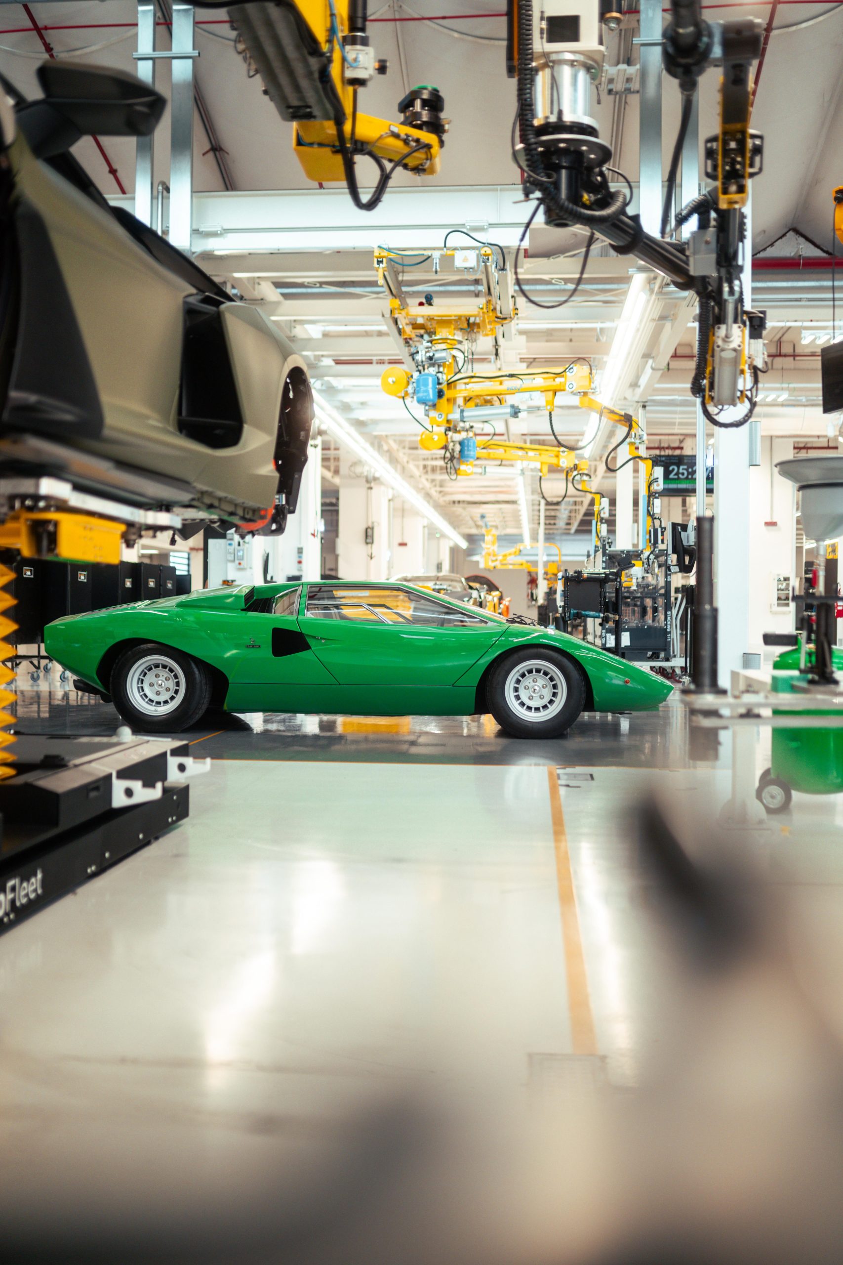The original Lamborghini factory comprised a 12,000 m2 covered area, with construction starting in 1963 and finishing in 1966, the same time as the gearbox and differential also started to be produced in-house. The factory included the production area, offices, testing rooms and service workshop. Production included two production lines: one for the engines and mechanical parts and the other for car assembly. On 18 October 1968, Lamborghini announced the forthcoming completion of the construction of three new industrial buildings, adding 3,500 m2 of covered area. Today the factory is quite different, covering an area of 346,000 m2, but the area where the Countach was assembled, known as the No.1 Countach Assembly Line, remains the same, and is now where the Revuelto, the new Lamborghini 12-cylinder plug-in hybrid car, is produced. During the Countach years, the assembly line was simple and small scale, with all the operations carried out manually. The bodywork panels were beaten and then checked on a wooden template before being welded together and adjusted on the car body mold. This final processing was essential, given that each part, having been produced and assembled by hand, appeared identical to the others but in reality each was slightly different. The complete body, still in raw aluminum, was then combined with the frame. This unit, sitting on an industrial trolley that ran on rails, traveled between the various assembly stations where the different mechanical parts were fitted. The Countach was also the first to involve the Lamborghini Upholstery Department, which in the beginning was only for the fitting and assembly of the interiors in partnership with external suppliers. It eventually became completely autonomous, including in terms of leather upholstery and stitching, becoming an essential part of the personalization still offered today by Lamborghini to its clients through the Ad Personam program. Today, the production line has changed, as has the machinery and materials used and is much more organized, efficient and ergonomic. While in the 1970s aluminum was used, now there is carbon fiber, which is also produced at the Sant’Agata Bolognese site. What hasn’t changed is the passion and care with which the operators produce the new cars.