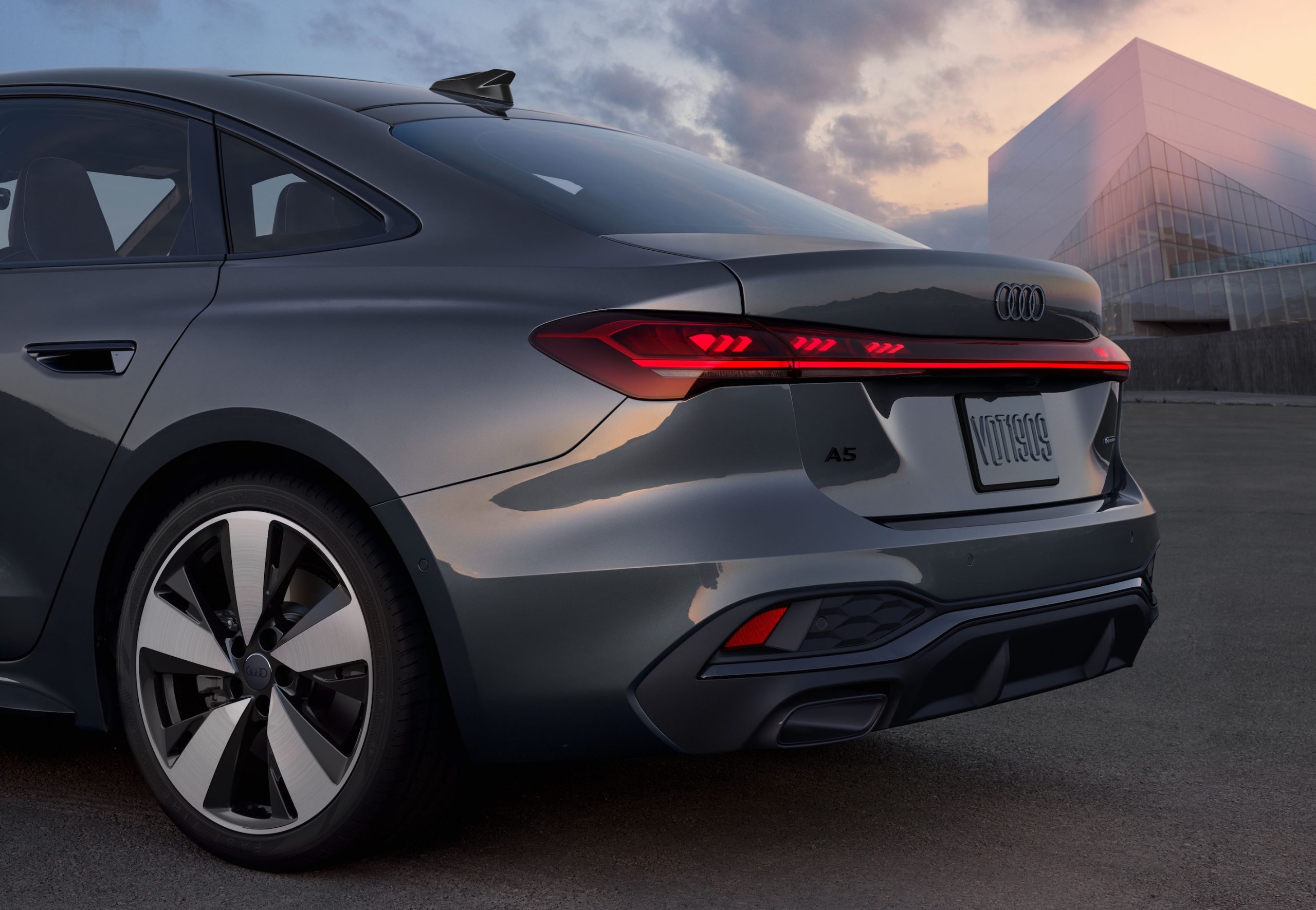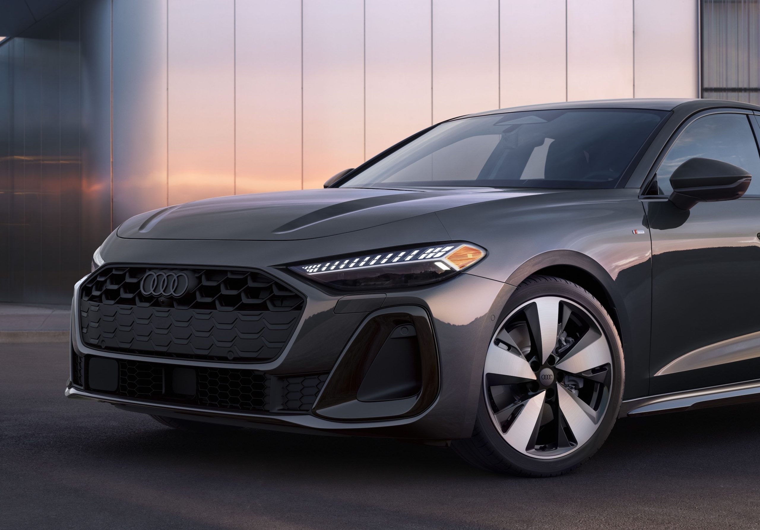 An S Sport suspension is now available on the 2026 A5, and the Warm weather package available on A5 Premium Plus trims (ventilated front sport seats, manual rear side window sunshades) adds Bang & Olufsen® front headrest speakers. An optional S line black optic package available on all A5 trims includes 19″ 5-arm-aero design bi-color finish wheels, Anthracite Audi rings, Black exterior trim and door handle inlays, Black wheel center caps, and Dark chrome exhaust tips. The 2026 Audi S5 receives similar trim level changes as the A5, in addition to the “dynamic plus” drive select mode (see below).