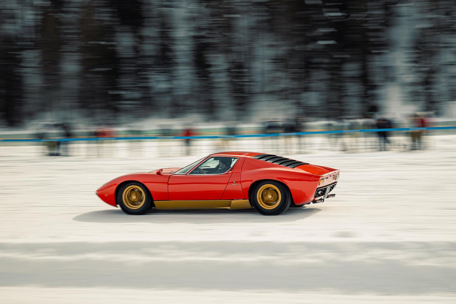 Among the vehicles that drew the biggest crowds was the eye-catching, legendary Countach LP 400S, also known as the “Countach Pace Car” because it was used as the safety car at the Monaco Formula One Grand Prix in 1981 and was the official car of the Race Director the following year. One of the most iconic Lamborghinis ever employed in a sporting environment, the Countach in question is currently being analyzed as part of the Polo Storico certification process. It was accompanied on the parade around a frozen St. Moritz by a red Miura SV that was certified by Lamborghini Polo Storico in 2018. It was the last and most powerful version of the model, which was launched by Lamborghini in 1966 and was the world’s first super car.