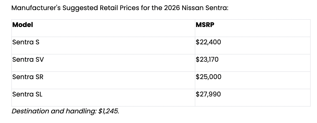Grabbing attention with an upscale new design and technology that simplifies the drive experience, the all-new 2026 Nissan Sentra represents impressive value with Manufacturer’s Suggested Retail Prices (MSRP) starting at $22,4001.