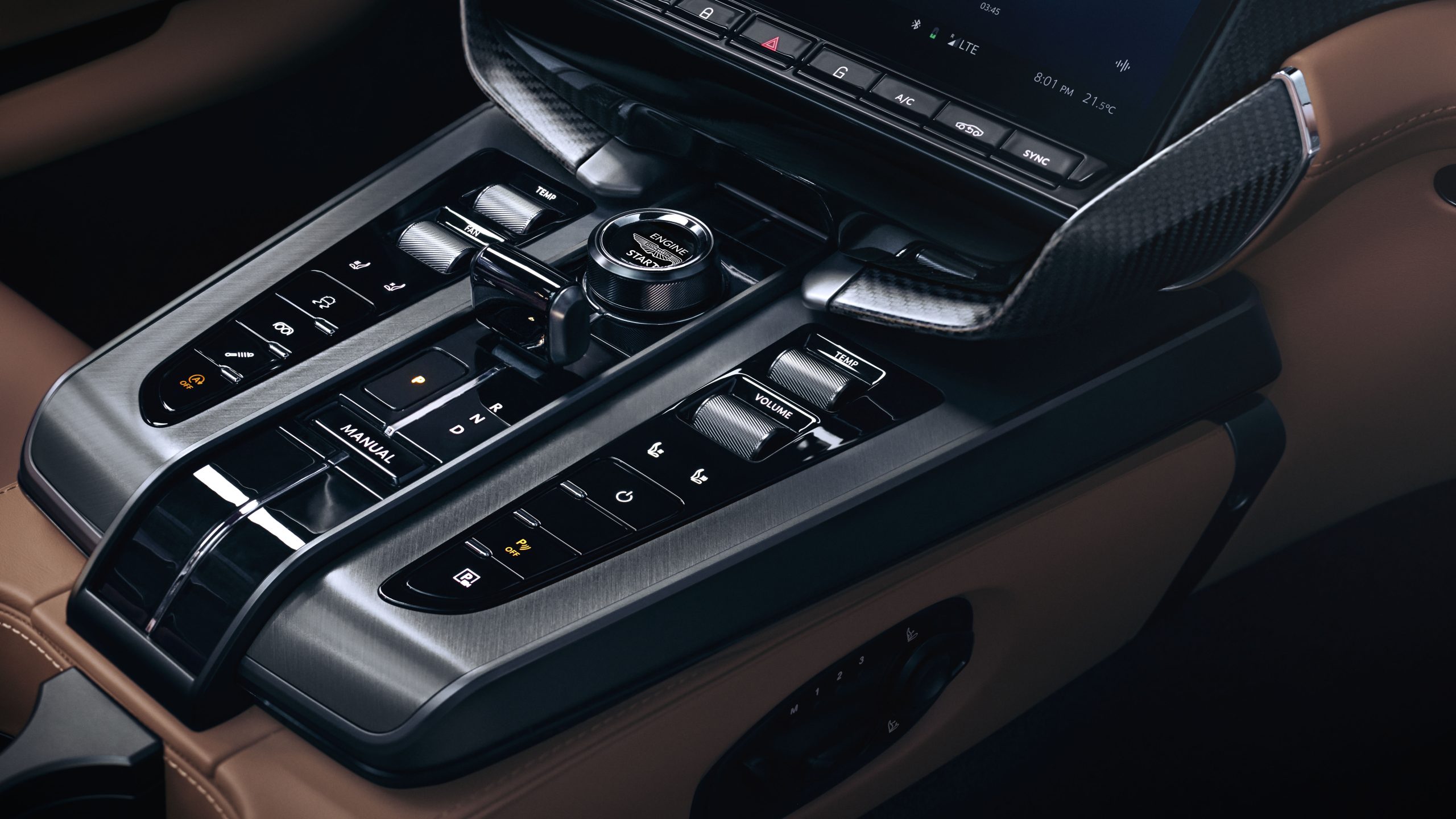 The screen provides user control for all infotainment, climate and general vehicle settings; well balanced with the tactility of solid metal rotary dials, rollers and exposed fixings which are cold to the touch, demonstrating the craftsmanship and pride that has gone in to building our flagship. These physical switches and buttons are retained for the key mechanical operations of gear selection, drive selection, heating and ventilation. There are also override switches for Chassis, ESP and Exhaust, Lane Assist and Park Distance Control, ensuring the most used controls can be operated intuitively and without the need to take your eyes off the road. The illuminated glass engine start/stop button sits centrally within the centre console providing an engaging start procedure that has become iconic to Aston Martin.