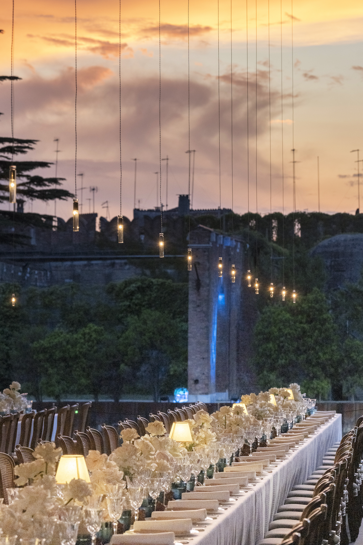 The evening began with a cocktail reception lining the canal whilst guests enjoyed an array of famous film scores with traditional Venetian Bellinis. Guests were treated to a three-course culinary experience by restaurant Dolada, which holds the longest standing Michelin Star in Italy, with cuisine responsibly sourced by Chef Riccardo De Prà in the surrounding areas of his Pieve d’Alpago restaurant.