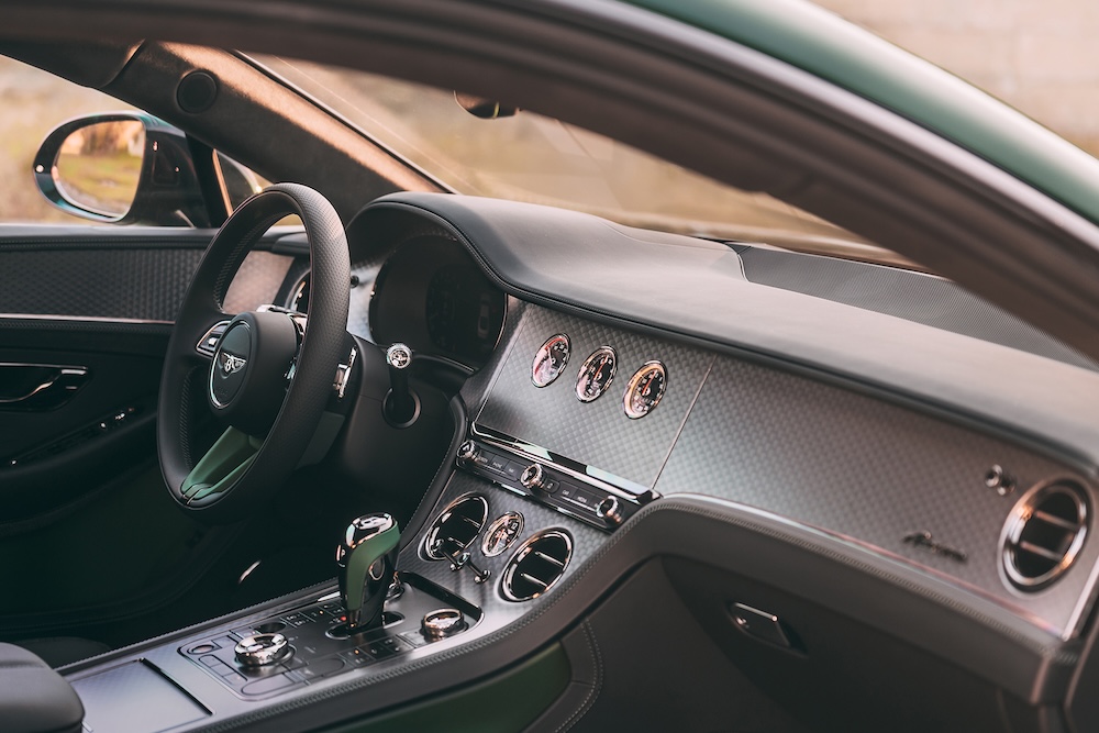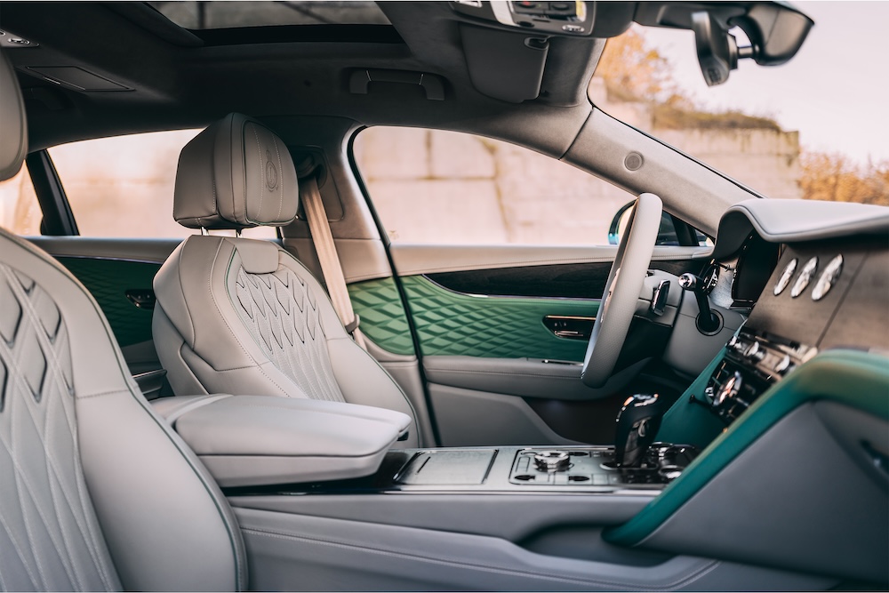 As with the exterior, the interior’s design palette is a tour-de-force of restrained yet harmonising colours and finishes. A bespoke colour split features Gondola Green as the main hide and Gravity Grey as the secondary hide, with Beluga as a third, accent colour. The Czech Collection Flying Spur is specified in four-seat configuration with a full-length centre console dividing the cabin. All veneered surfaces, including console, waistrails and fascia, are finished in open pore black stained Crown Cut Walnut. The headrests feature laser-etched Squadron 313 insignia front and rear, while the bespoke treadplates feature the Spitfire profile together with the squadron motto ‘One hawk chases many crows’.