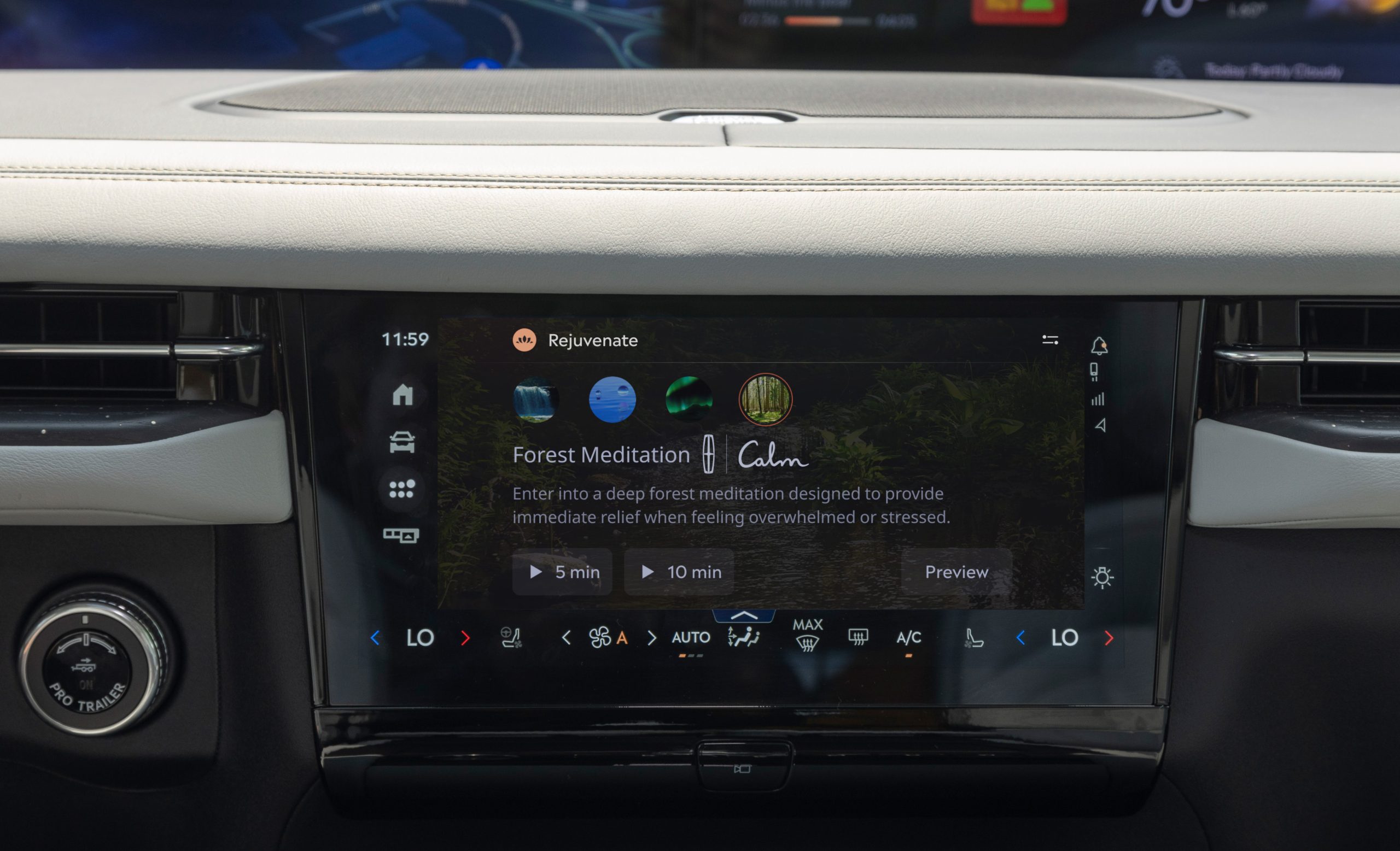 With Lincoln Rejuvenate, your vehicle becomes a third space, a sanctuary between home and work, offering a moment to unwind after a busy day or prepare for the journey ahead. The new Forest Meditation theme is designed to transport clients into a serene natural setting, complete with calm forest visuals, immersive sound which can be paired to the subtle scent of Mystic Forest, all evoking the peacefulness of a walk through nature. Narrated by Tamara Levitt of Calm, the theme features a body scan meditation that guides listeners to tune into each part of the body, from head to toe, in 5- or 10-minute sessions.