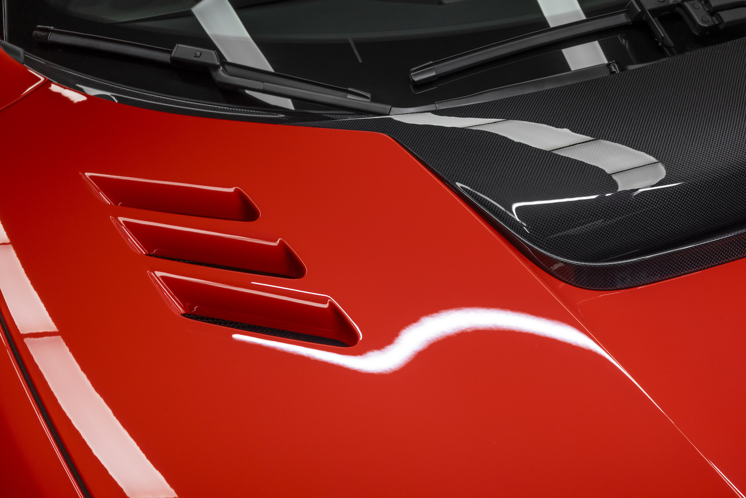 Also on the front bonnet, and echoing the aerodynamic language package of the 296 GT3, are two pairs of louvres situated at the sides: these features exploit the powerful depression generated in the vicinity of the wings to reduce pressure in the wheel housing and improve both drag and downforce.