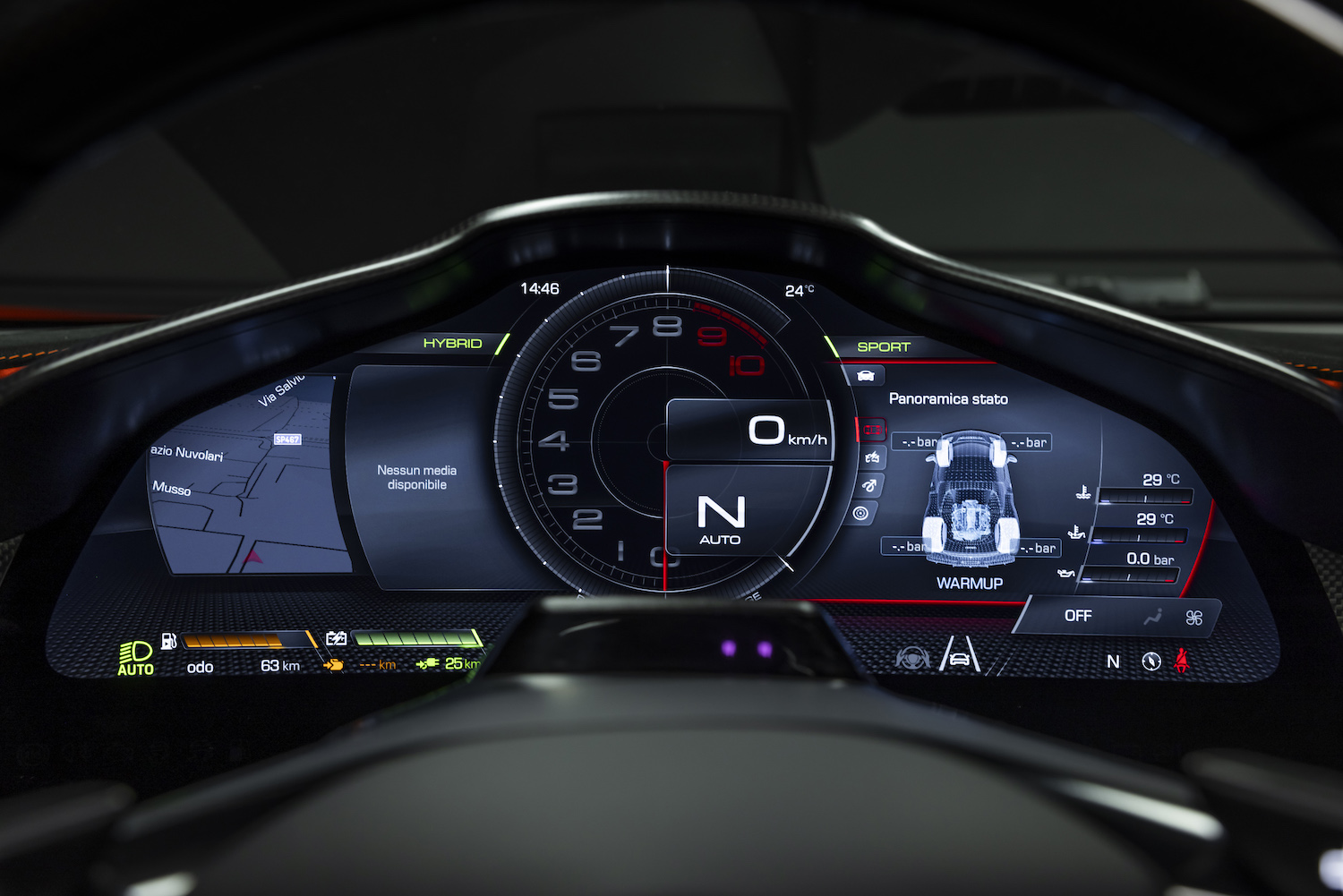 A specific curved indicator on the instrument cluster, placed on the right-hand side of the tachometer, lets the driver know when boost power is available and displays how many extra boost bursts are left. The control strategy optimises the function to ensure enough boost bursts to complete at least one whole lap of the circuit the car is on. This is made possible by a heuristic approach which considers the circuit as a whole and allows the strategy to determine where boost power will be most effective and exclude sections of the track where it would offer no benefit. At the Fiorano circuit, for instance, the extra boost function can be used 14 times over two laps, while at Mugello, the function allows for a total of 15 boost bursts over a single lap.