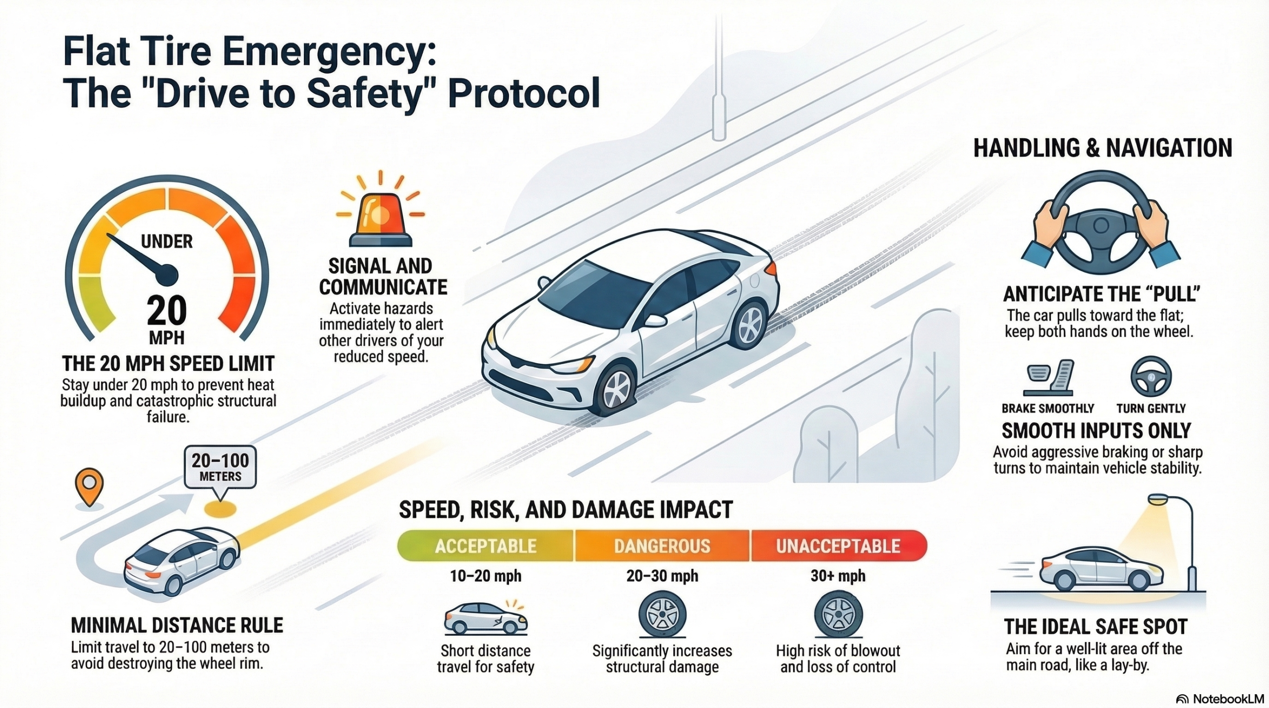 On motorways and highways with high-speed traffic, the risks escalate from the speed differential between you and other vehicles. Drive at the absolute minimum speed necessary (10-15 mph) to reach safety. The risk of being hit from behind is real, so hazard lights are non-negotiable.