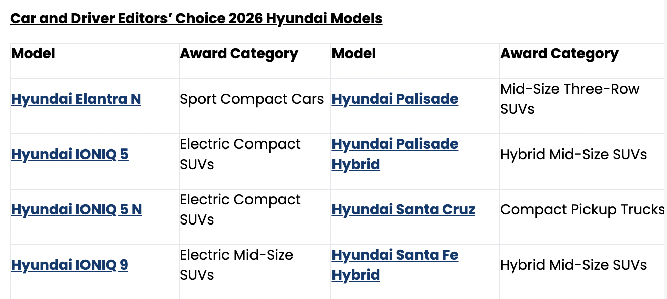 Hyundai Models Impress Car and Driver, Claim Eight 2026 Editors’ Choice Awards