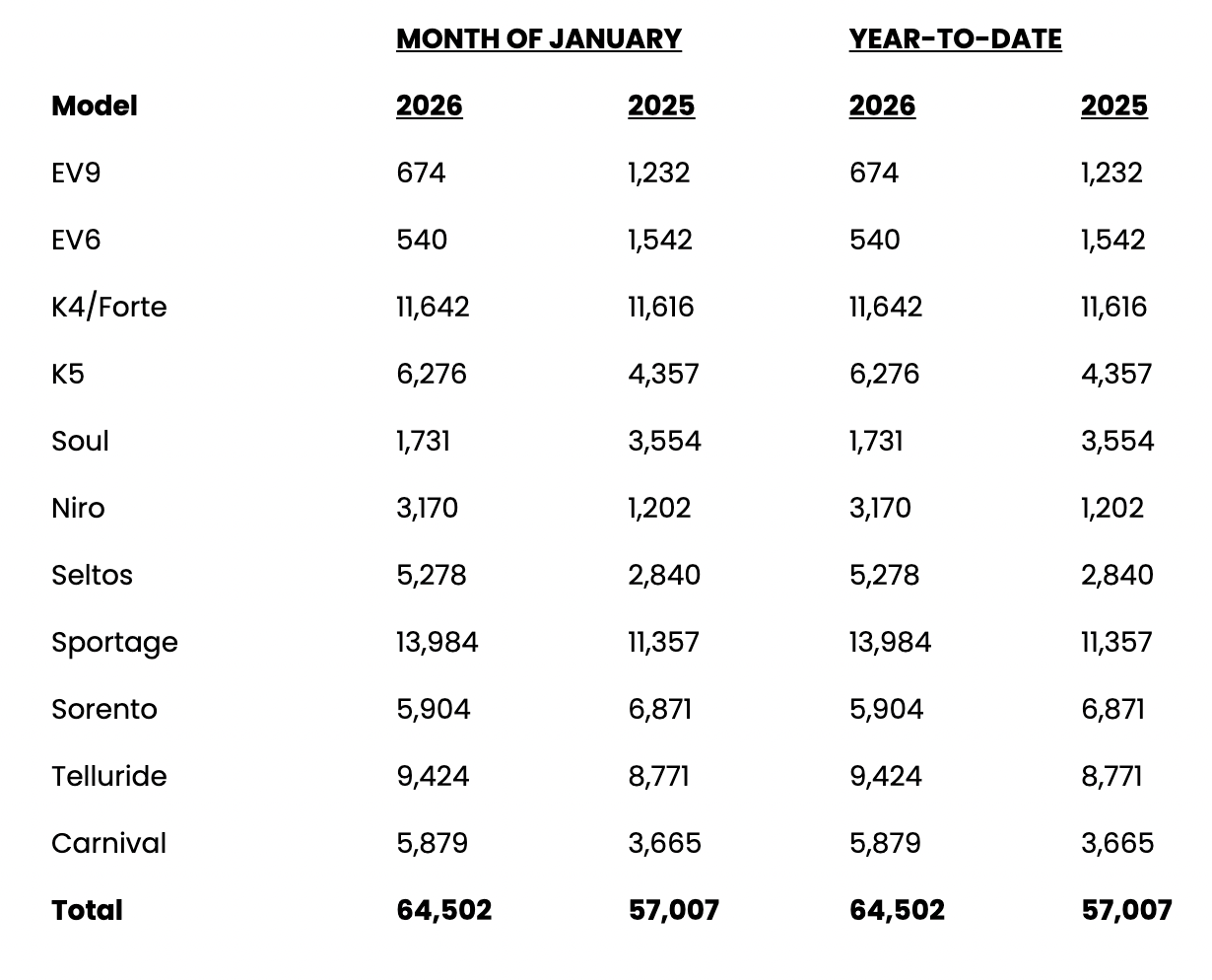 Kia America’s record-breaking sales streak continued into the new year with January sales of 64,502 units, a 13 percent increase over the previous high set in January 2025.