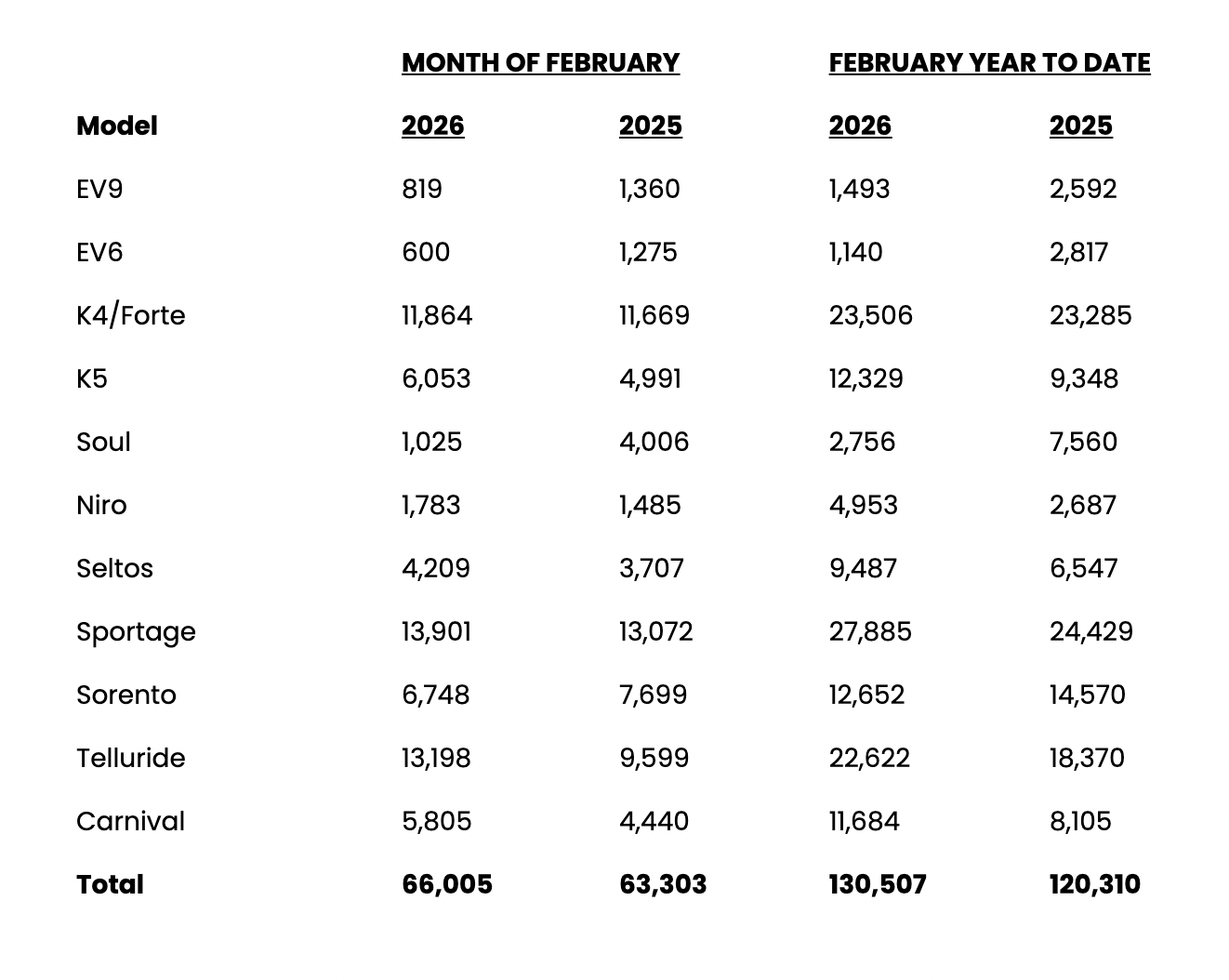 Kia America’s record-breaking streak continued into February with sales of 66,005 units, a 4 percent increase over February 2025. Sales of Kia’s hybrid models also reached a new February record, increasing 53 percent over the same period last year.