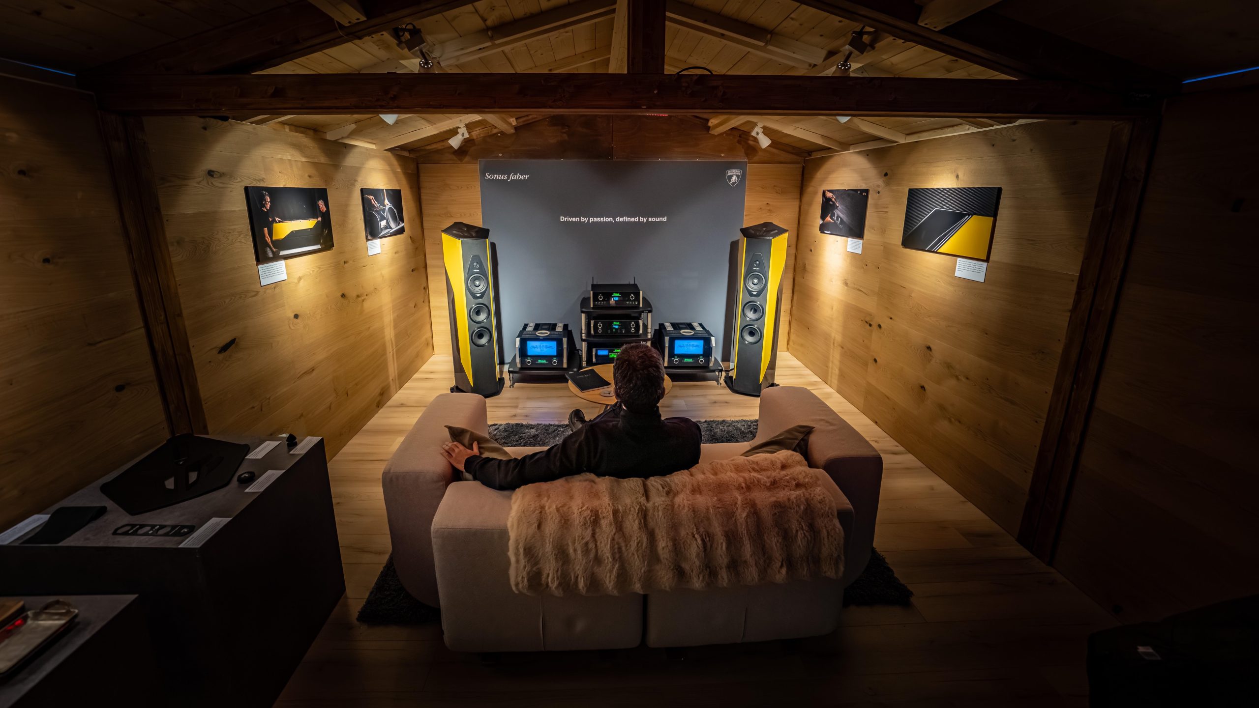 Sonus faber set up a genuine chalet dedicated to the brand, where guests could enjoy listening experiences with the exclusive Il Cremonese Ex3me-Automobili Lamborghini Edition speaker and discover the world of Sonus faber craftsmanship. Working alongside the Lamborghini team, the brand also organized hot laps set to music, with a curated playlist accompanying every maneuver, delivering a unique immersive experience. The world of sound also played a leading role in the hospitality areas: Sonus faber equipped every area and the lounge with the Omnia system and offered in-car demos during dinner.