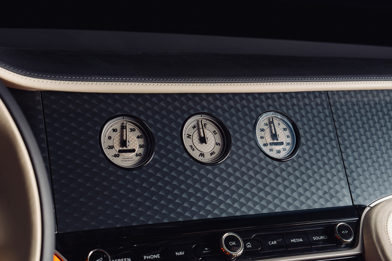 The specification of this Batur Convertible reveals a passion for detail on the part of the commissioning owner, brought to life by the meticulous craftsmanship of the Mulliner team. The fascia and door waistrails are executed in a subtle satin black engine spin finish, with gloss Beluga veneer for the centre console. Outer dial bezels are finished in Beluga while the dial faces themselves are finished in light titanium.