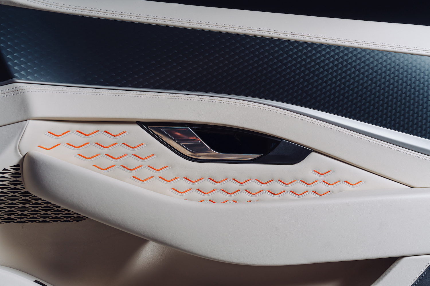 In dramatic contrast, the passenger reclines in a sports seat in Linen hide and Alcantara with Mandarin detailing. The Batur pattern detailing on seat and door insert is on a Linen background with Mandarin contrast stitching.
