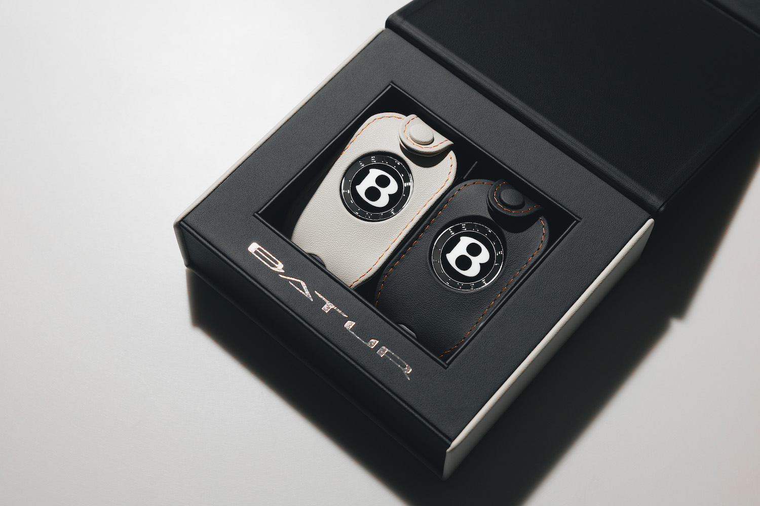 Opening the rear luggage compartment reveals another delightful bespoke element. A two-piece luggage set nestles within; one corresponding to the driver’s colour scheme in Beluga and the other in Linen. As a finishing touch, Mulliner also created two bespoke key cases in the two colourways.