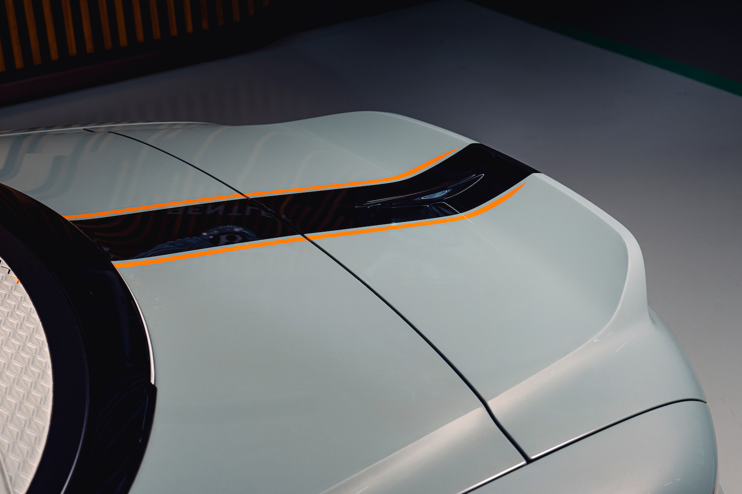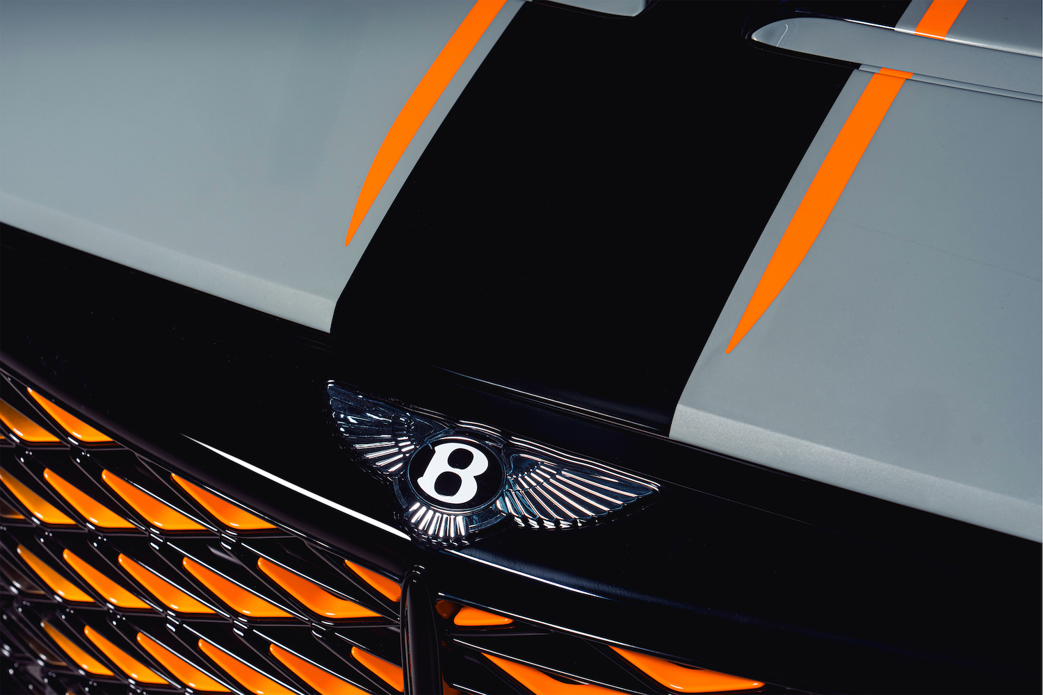 The design of this first Batur Convertible emphasises the extraordinary performance of its 740 bhp, W12 powertrain. The shimmering silver of the Opalite finish exterior is bisected by a black gloss Batur racing stripe bordered on each side by Mandarin pinstripes. The painted feature racing stripe, embedded seamlessly into the bodywork, begins at the radiator and runs rearwards over the bonnet and cockpit ‘airbridge’ before resuming along the rear deck to the Bentley wings badge. At the rear, these elements are connected by bespoke embroidery in the same formation over the rear Tonneau. The Batur’s distinctive matrix grille is finished in gloss Beluga with Mandarin orange highlights, while the same base and accent shades feature on the five-spoke alloy wheels.
