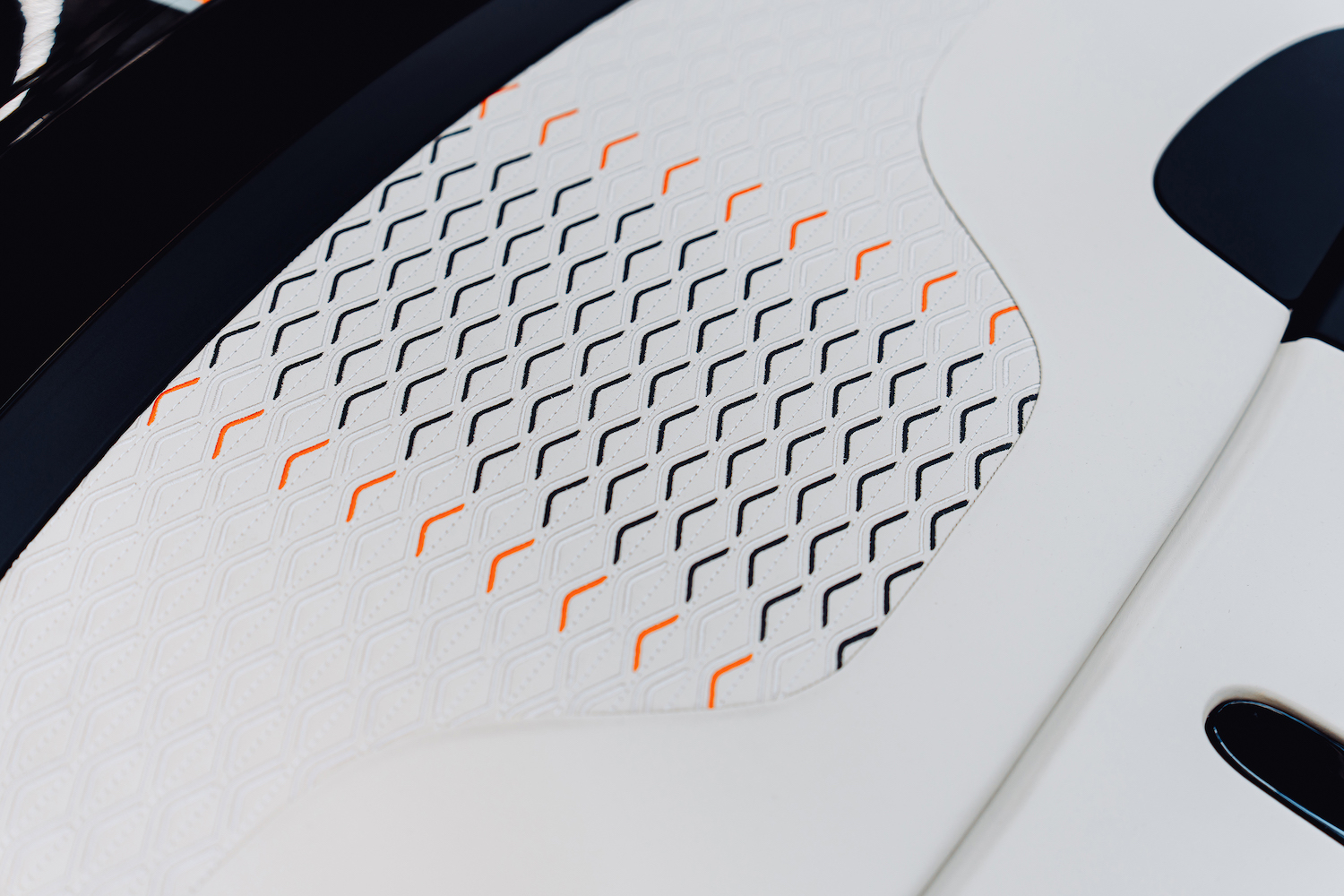 Behind the two seats, the interior luggage area follows the same template, with the unique Batur pattern design in Beluga on the driver’s side and in Linen for the passenger. Even details such as the matching key cases and seat belts are co-ordinated to the two respective colourways.