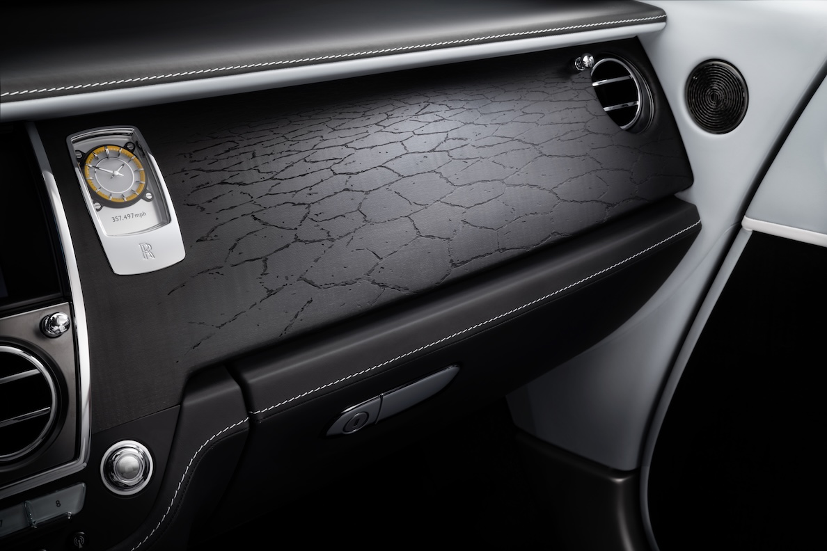 Rolls-Royce designers wished to present this bold new expression of the brand to the world in a signature treatment: one of the motor car industry’s darkest blacks. To create it, 45 kg (100 lbs) of paint was atomised and applied to an electrostatically charged body-in-white before being oven-dried. The motor car then received two layers of clear coat before being hand-polished by four craftspeople to produce the marque’s signature high-gloss piano finish.