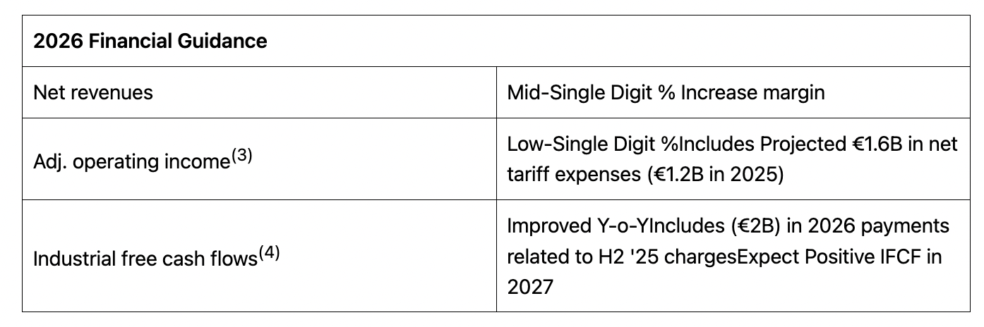 Second half 2025 Net revenues and Industrial free cash flows improved compared to the first half of 2025, consistent with the Company’s latest financial guidance. However, results were negatively impacted by specific items, including the change in estimate for contractual warranties, and other items, resulting in AOI margin for the second half of 2025 finishing below the guided low-single digit range.
