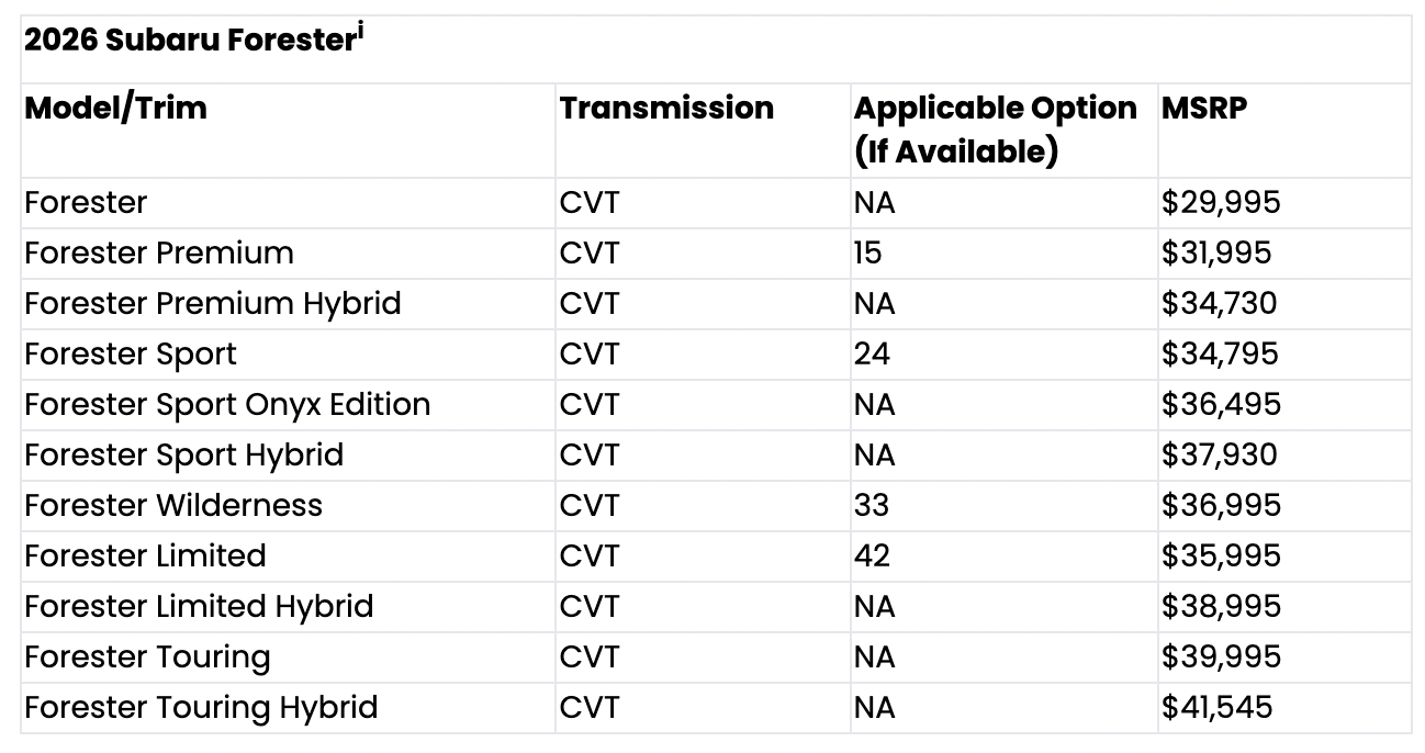 Updated pricing with emphasis on affordability and value on more than 90% of Subaru Forester models, including Forester Hybrid, Forester Wilderness, and Forester gas modelsNew Forester Sport Onyx Edition trim level with 19-inch dark finish wheels with blacked-out interior and exterior accentsEfficient next-generation Subaru hybrid powertrain up to 40% more efficient than non-hybrid counterpart2026 Subaru Forester Hybrid starts at $34,730 MSRP