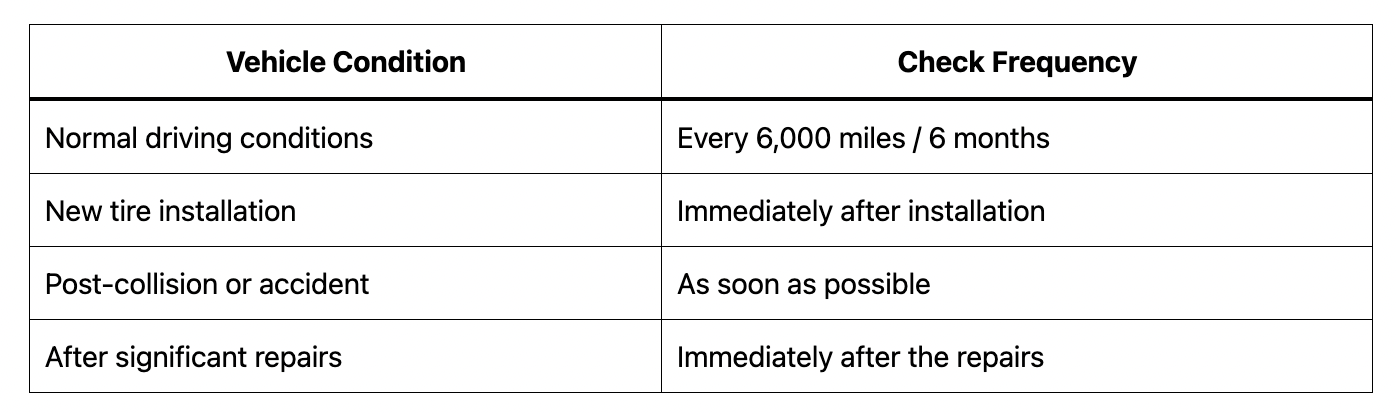Alignment should be checked periodically as part of regular vehicle maintenance or when:
