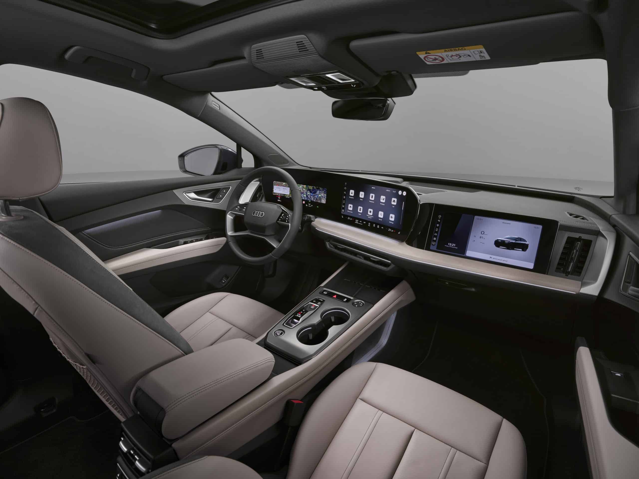 The cabin has been redesigned from the ground up around what Audi calls the digital stage. A panoramic display pairs an 11.9-inch instrument cluster with a 12.8-inch MMI touch display running on Android Automotive OS, giving direct access to apps through the Audi Application Store without needing a connected smartphone.