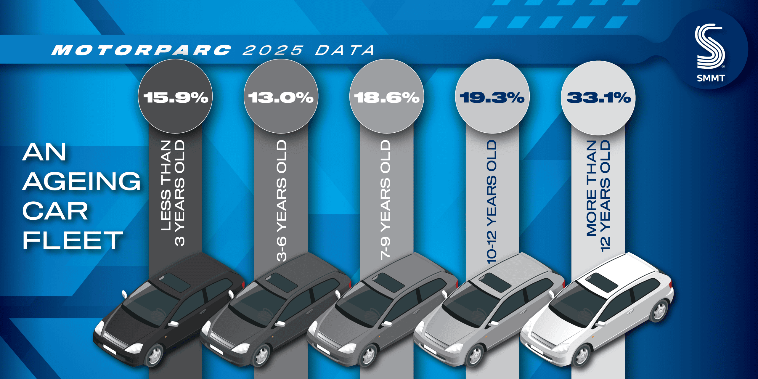 The headline that should concern the industry and policymakers alike is the age of the cars on UK roads. A record 45.7 per cent of all cars in use have now been in service for more than 10 years, up from 43.4 per cent in 2024. The average age of a car on British roads has risen to 9.7 years, up from 9.5 in 2024 and a new record high.