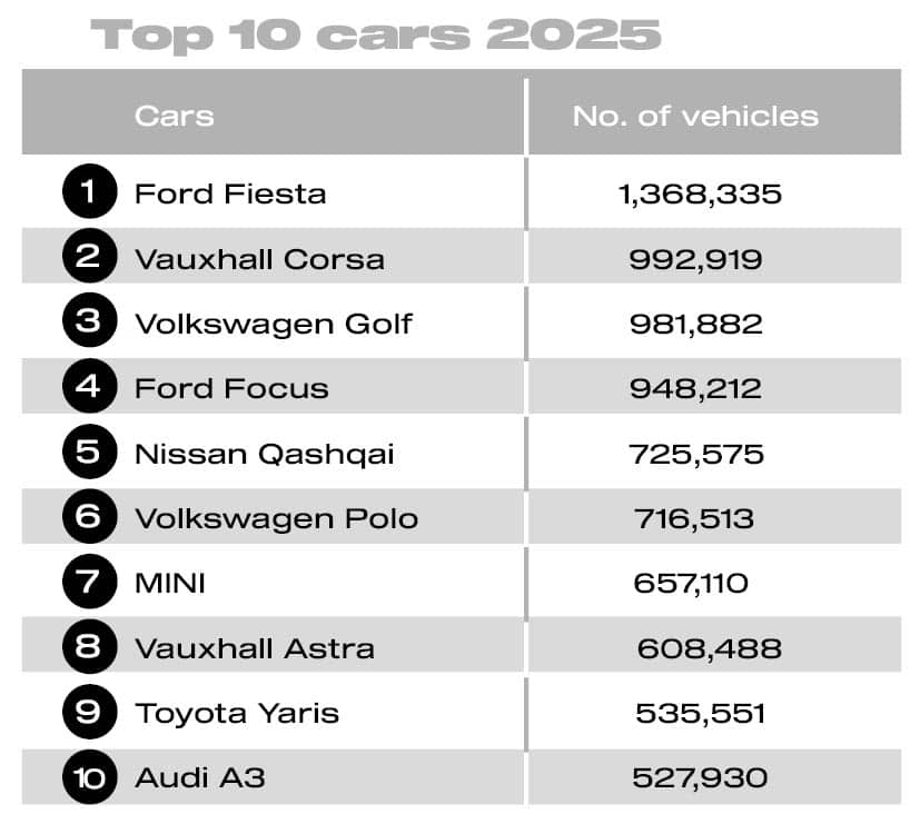The data on what cars are most common on UK roads provides a snapshot of the nation’s driving habits that no new car sales chart can match. The Ford Fiesta remains the most common car on British roads despite being discontinued, with nearly 1.4 million still in daily use, accounting for 3.7 per cent of the entire car parc. The Vauxhall Corsa, Volkswagen Golf, Ford Focus and Nissan Qashqai complete the top five, and together these five models account for 13.7 per cent of all cars on the road.